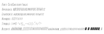 Cute Cartoon is a whimsical font family designed for Windows that embodies the playful essence of hand-drawn comic lettering. With its slender and slightly irregular strokes, this font captures a breezy and casual aesthetic, making it suitable for a variety of creative projects. It features both regular and italic styles, where the italic variant adds a dynamic flair, enhancing its energetic feel. This font is particularly effective for quirky logos, children's book covers, playful posters, and eye-catching packaging, ensuring excellent legibility despite its thin lines.
